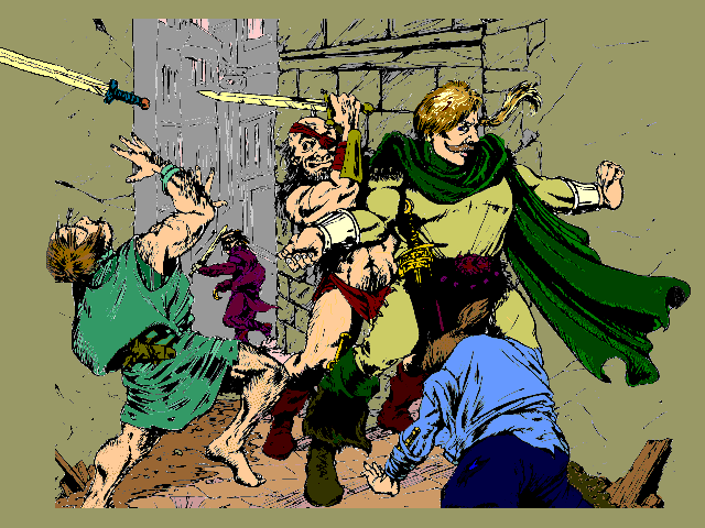 An animated-style picture of a sword fight in a castle.